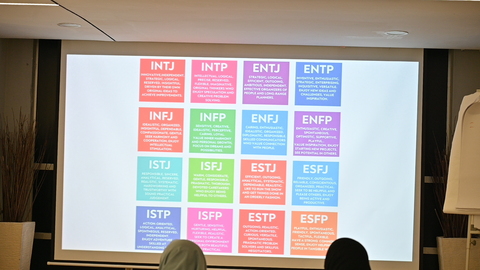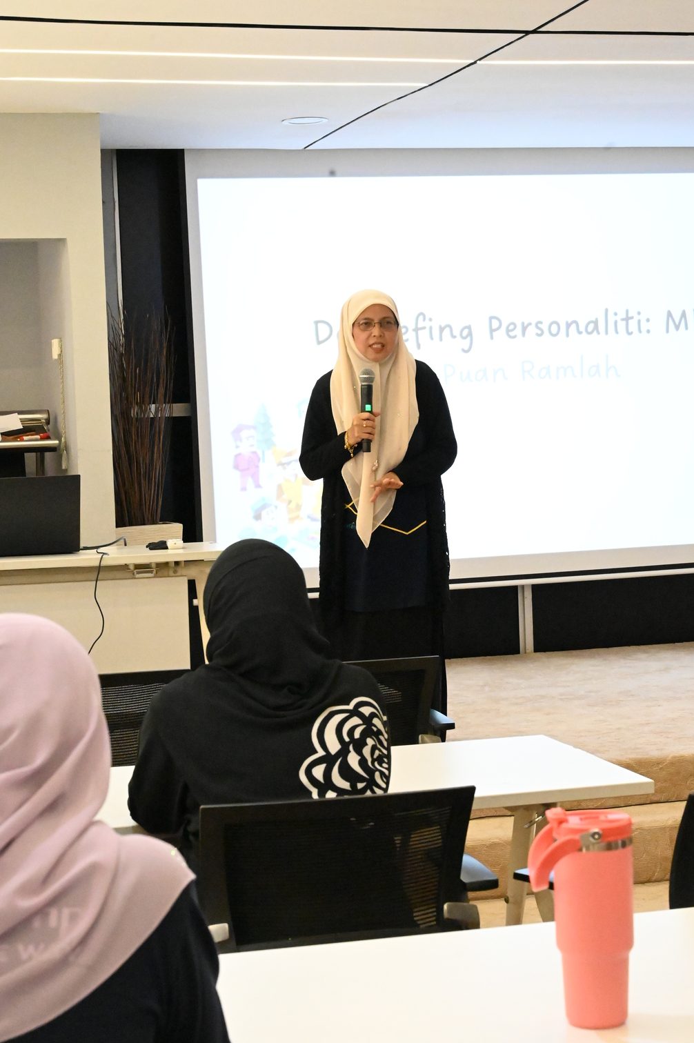 Sesi pertama oleh Puan Ramlah memperkenalkan konsep Myers-Briggs Type Indicator (MBTI) β satu alat psikologi yang membantu kita memahami gaya personaliti diri dan rakan sekerja.