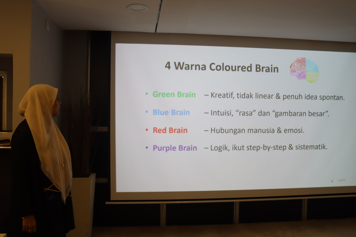 Sesi diteruskan dengan Colored Brain Communication Inventory (CBCI), juga dikendalikan oleh Puan Ramlah. Melalui pendekatan ini, peserta mengenali empat warna otak: